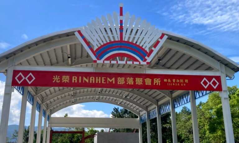 部落聚會所建築外觀,牆上的鄉長落款字樣,就是這一行落款引發爭議。