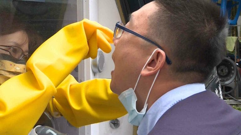 採檢人員透過擴音器跟民眾溝通,幫隔離期滿民眾做採檢。