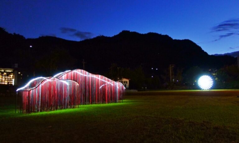 五彩繽紛的燈光隨著原住民歌謠明暗閃爍,營造部落傳統祭儀氛圍,藝術家在知本溫泉區的草皮上,利用各種顏色燈光,展現光與自然的互動,也呼應與在地部落的文化連結。
