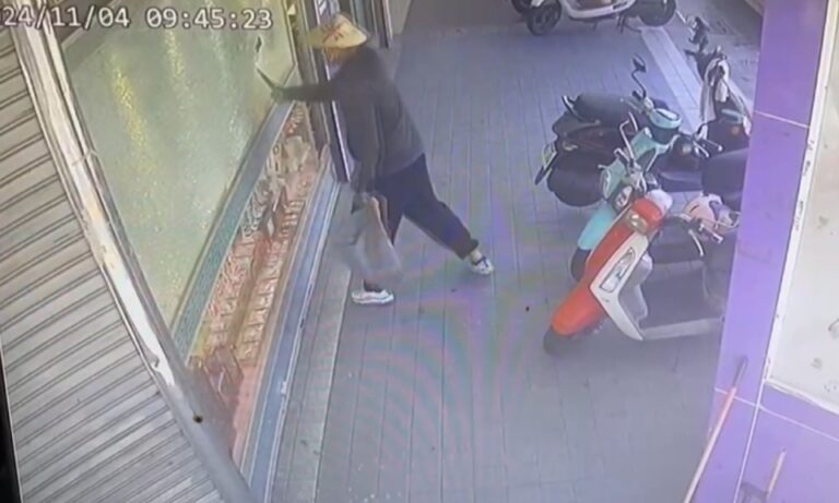一名頭戴斗笠的男子,拿著榔頭對著玻璃櫥窗一陣猛打,再將裡頭的金飾往包包裡塞,光天化日之下竟大膽打劫銀樓,沒想到下一秒… 穿著粉色外套的婦女看到男子正在行搶,竟不顧對方手持榔頭,第一時間衝去制止,隨後又有2名男子上前協助,最終3人合力成功將搶匪壓制在地。