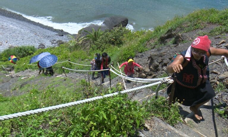 一根根鋼板插在邊坡上防止土石滑動,周邊更是圍起了水泥牆和鋪上了水泥道路,屏東環境保護聯盟的律師就指出,依據「公共工程生態檢核注意事項」,中央經費超過50%的工程應該要進行生態檢核,也有另外規定必須是要在「原構造物範圍內」,不過拿出過去的照片來看,阿朗壹古道的南端入口處原先的樣貌卻不見建築物。