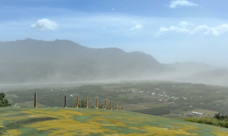 一波波風沙席捲而來,將整片卑南溪河床染得灰濛濛,大量細沙隨風飄散,往鄰近部落與社區吹去;受到東北季風增強及低壓影響,台東縱谷地區22日出現嚴重風飛沙情形,站在鹿野高台俯瞰,整片平原宛如被薄霧籠罩、沙塵漫天,能見度明顯下降。