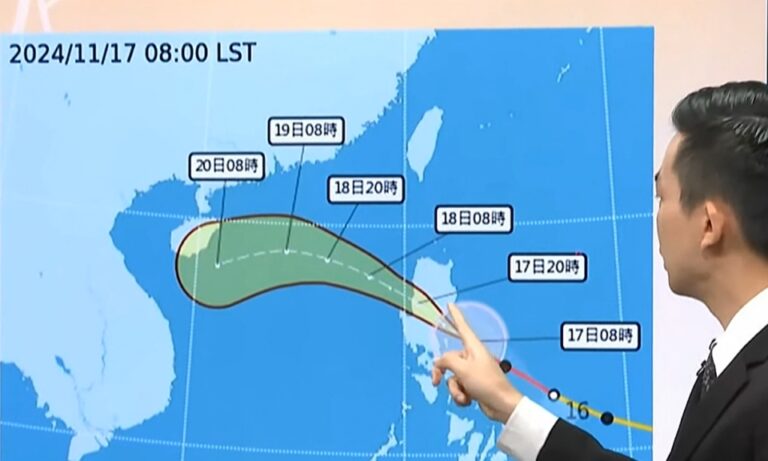 氣象署預報員 張竣堯:「我們關心目前在菲律賓東方的萬宜颱風,強烈颱風萬宜在早上八點的位置,它會是在鵝鑾鼻南東方約800公里的海面上,那以未來的路徑來看的話,今天就有機會登陸呂宋島,周一至周二進入南海,雖然不會直接影響到台灣,但會有間歇的水氣從南邊輸送到台灣上空,因此周一至周二雨量偏多。