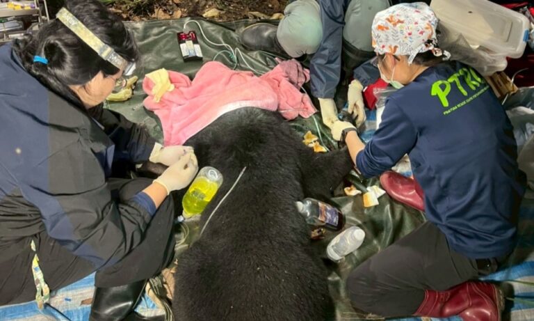 畫面中,一隻黑熊坐在地上不斷掙扎,顯然並非在覓食。