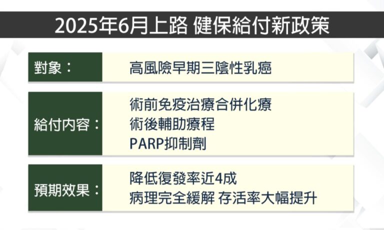 醫療 三陰性乳癌 健保給付 三陰性乳癌治療 輔助免疫治療納健保給付 195 三陰性乳癌,被醫界視為最棘手的乳癌亞型之一,不僅惡性度高、復發快與轉移風險大,且經常出現在年輕女性身上,而且治療選項有限、費用難以負擔。 2025-06-27 12:30