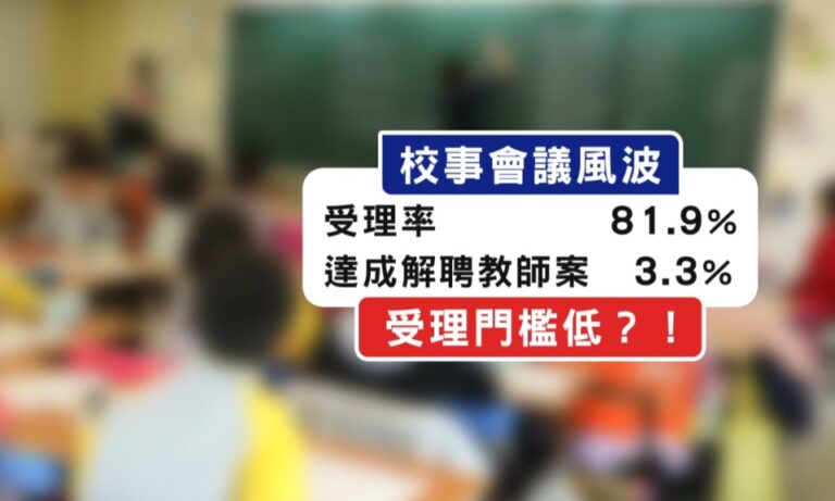 教文 立法院 全台教師荒 公聽會 校事會議 還教師友善校園環境 廢除「校事會議」呼聲高 50 屏東教育產業工會理事長 郭瑋真:「你有可能跟校事會議的委員沾到一點邊,老師們就會把你當成箭靶,為什麼會這麼可怕?」 處理校園教師檢舉、甚至判定教師是否適任的校事會議,令不少教師團體抗議,因為匿名檢舉等機制,使得濫訴的狀況頻繁;全教總以去年統計觀察,校事會議案件受理率81.9%、但最終結果達到解聘僅3.3%,顯示校事會議長年問題。 2025-11-24 19:07