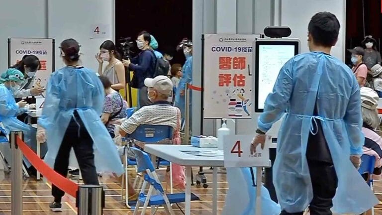民眾排隊量體溫填寫資料,準備接種疫苗。