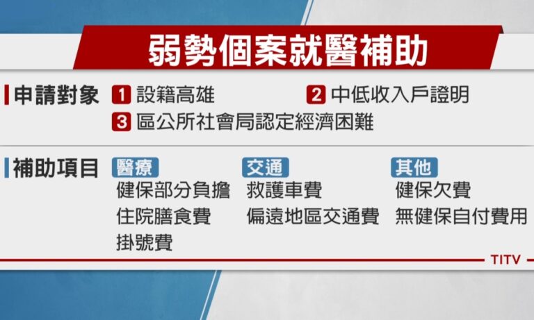 為協助經濟弱勢民眾減輕醫療負擔,高雄市府推動「弱勢就醫補助」設籍高雄且有中低收入戶證明、或區公所社會局認定經濟困難,可補助健保部分負擔、住院膳食、掛號費,以及救護車費、偏遠地區交通費、健保欠費等,每人每年最高補助3萬元,涵蓋醫療及交通相關費用,保障民眾基本健康權益。