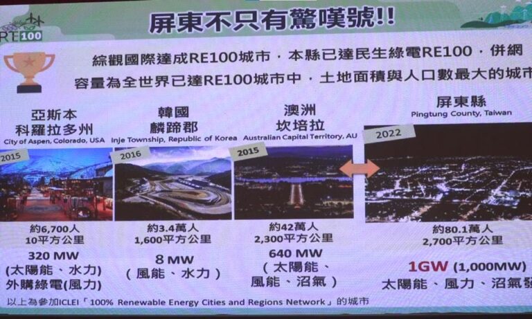 屏東縣政府9號宣布,屏東縣再生能源併網容量已經達到10億瓦,成為RE100的民生綠電城市,RE100是百分之百使用再生能源的國際規範,屏東目前不但電量可涵蓋所有民生用電,也整體規劃閒置國有地活化再利用,讓綠能發展繼續向前。