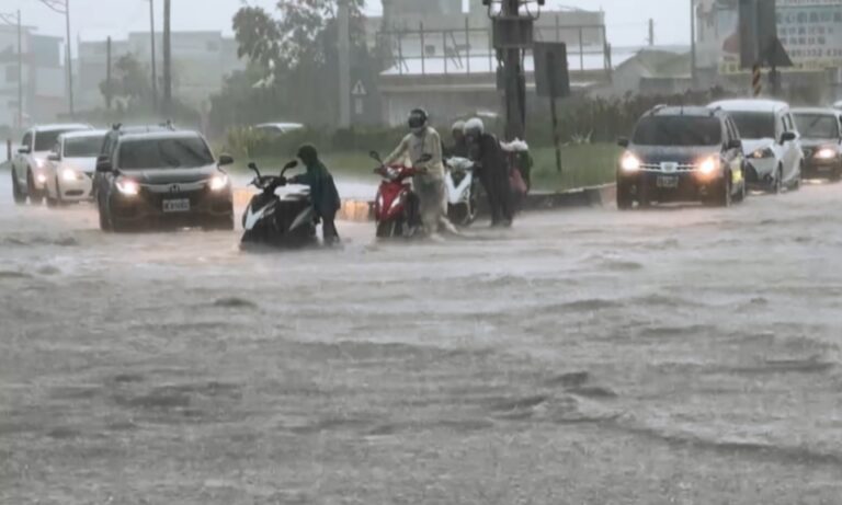 原鄉 風災 凱米 台東市區 超大豪雨 台東強降雨下不停 鹿野熱氣球活動急喊卡 95 大雨不停地下,把大馬路淹得像汪洋一般,機車騎士沒辦法前進,一群人只好下車,用手將車子慢慢往路邊牽。 2024-07-28 19:04