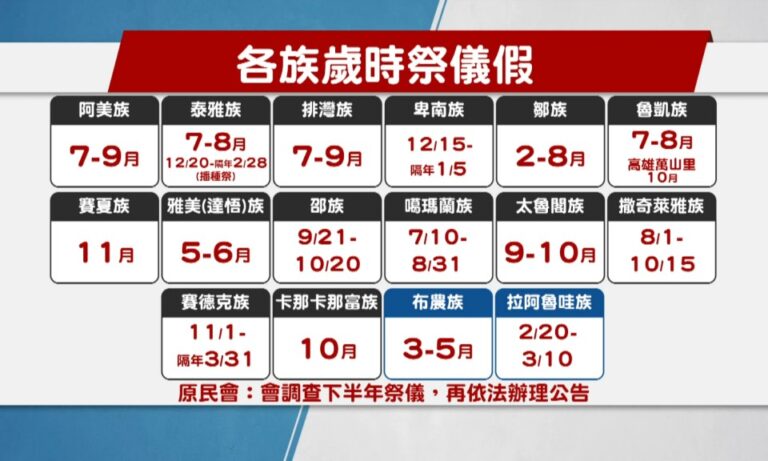 社會 祭典活動 原住民族歲時祭儀假 增加為三天 歲時祭儀假增至3天 僱主尊重文化表支持 296 立法院(9)日三讀通過,將原住民族歲時祭儀假從一天增加為三天有更充裕的時間回到部落參與祭典,族人都是樂觀其成。 2025-05-19 19:08