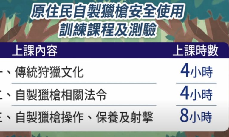 台灣原住民族使用自製獵槍長年面臨安全與合法性爭議,大法官釋字第803號解釋更點出《槍砲彈藥刀械許可及管理辦法》規範不足,造成台灣原住民族在狩獵傳統文化與現行法律之間衝突;為了平衡文化傳承與用槍安全,原民會、內政部、國防部以及各方攜手合作下在2日辦理第一梯次原住民自製獵槍安全使用訓練課程及測驗。