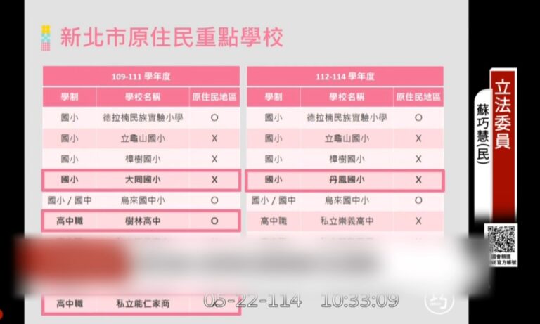 原住民族教育在中小學和高教現場都面臨挑戰,立委蘇巧慧點出,國中小實施原住民族教育的「原住民重點學校」機制,是以原民學生人數或比率作為門檻欠缺彈性,導致門檻邊緣的中小學無法長期推行原住民族教育。