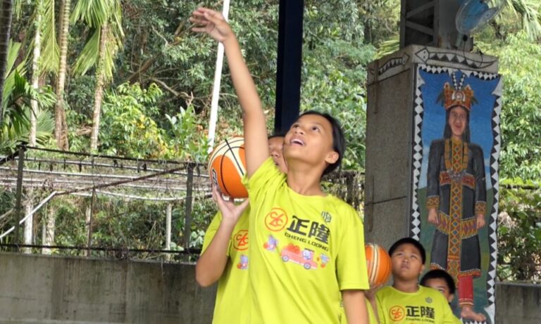 兩人一組相互傳接球或是練習基本運球,這是正隆關懷兒童基金會和中華民國國民小學體育總會,來到台東達仁鄉安朔村辦理公益籃球訓練營,邀請南迴線上5所以上國小學生免費參加,特別邀請2018年U18中華女籃總教練李陸臻擔任其中的教練之一,指導學生核心的基礎訓練。
