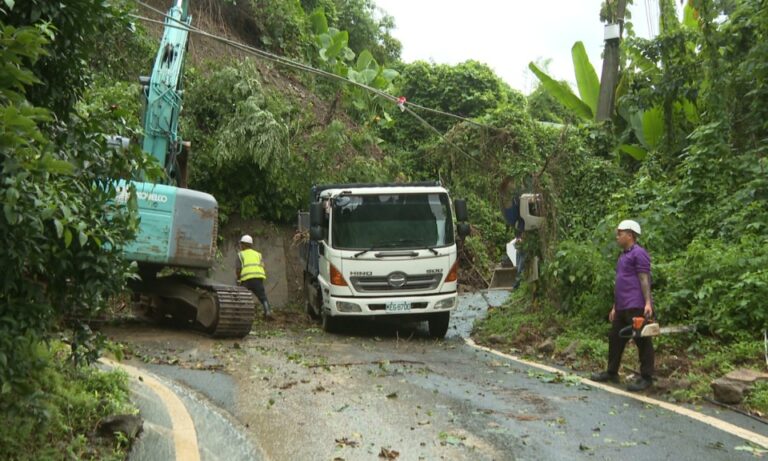 記者 Aniw(李星儀):「記者現在所在的位置就在和平達觀里天嶺巷路段,雖然丹娜絲颱風已經離開,但是可以看到後方因為昨日(6)大雨的關係,就造成了農路坍方;達觀里里長就說明這裡其實是族人主要行經道路還有農特產的區域,就在今天(7)早上的時候就緊急聯絡了廠商機具進行搶修。