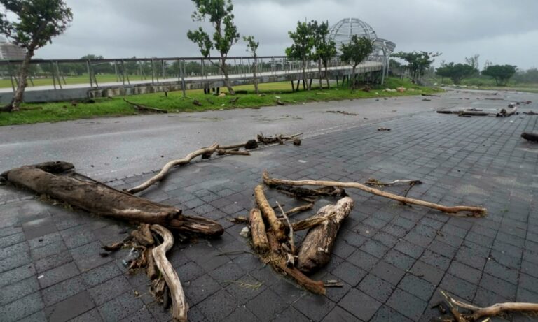 強颱「樺加沙」雖然逐漸遠離,但外圍環流卻持續影響台東,富岡漁港更掀起6米巨浪,不少地方海水打上岸,知名觀光景點「國際地標」旁也滿布石塊和漂流木。
