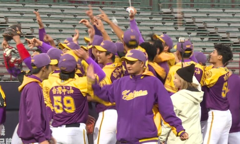 台體大打者揮棒,開南大學內野手穩住接殺,三人出局結束比賽;穿著紫色球衣的學生們衝出圍欄,大家共同歡呼慶祝拿下季軍的喜悅。