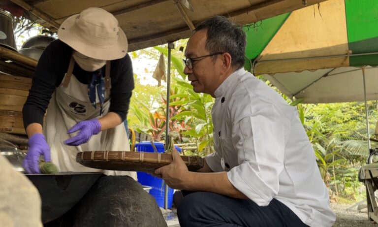 原鄉 傳統食物 吳寶春 芋頭 飲食文化 吳寶春訪來義小農 認識排灣族芋頭飲食文化 245 甲酸醬葉鋪好,放上和著芋頭粉的醃肉,包起來裹著甘蔗葉再綁上繩子,來義在地芋頭粉原型完成,冠軍麵包師傅吳寶春在民族植物專家董景生介紹下,帶領經營團隊來到屏東來義鄉,一起來認識在地的原生種芋頭。 2024-03-11 12:41