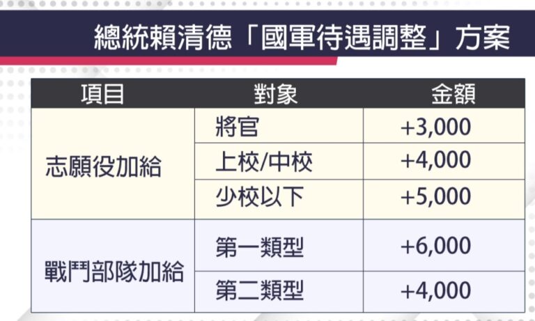 政經 國軍加薪方案 志願役加給分等級調整 賴總統宣布國軍4/1起調薪 最高月增12000 2912 總統 賴清德:「我要藉這個機會向各位宣布,我們將提升志願役勤務加給,以及戰鬥部隊加給。 2025-03-24 12:14
