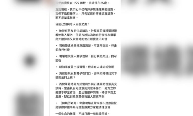 社會 埔里女子身亡 埔里女赴男友家墜樓身亡 檢調解剖追真相 1325 南投埔里一名年僅25歲的阿美族陳姓女子,1月28日晚間在跟朋友聚會完後,搭計程車前往男友住處,卻墜樓身亡,至今死因仍引發家屬質疑。 2026-02-11 19:21