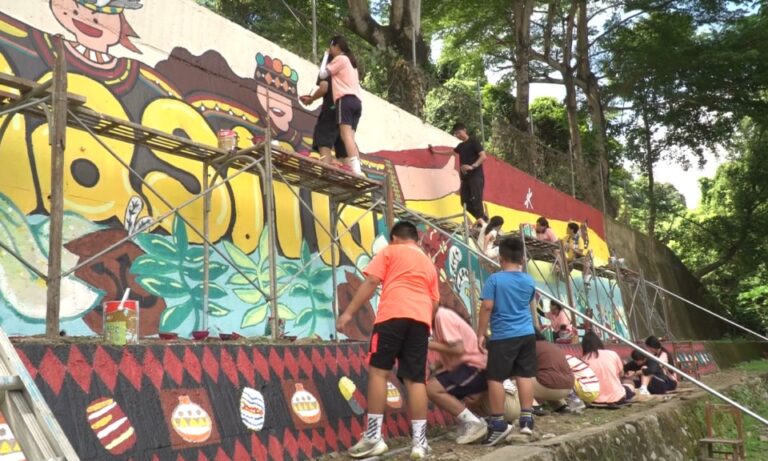 一筆一畫仔細的上色,畫出排灣族代表性文物琉璃珠、陶壺,屏榮高中多媒體設計科「媒你不可設計志工服務」社團,連續3年暑假到原鄉當志工,今年來到瑪家鄉北葉國小彩繪停車空地旁的牆面,學生與北葉國小老師經過兩個多月的討論,由學生設計主題為Masilid北葉部落彩繪迎賓牆。