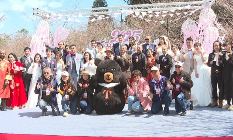 在眾人的祝福下,新人佳偶溫馨進場,參山國家風景區管理處主辦2025雲端上的婚禮,來自香港、新加坡等各個地方12對新人,在適逢櫻花盛開的時刻,選定梨山福壽山農場千櫻園,共同見證愛的誓約,除了創造滿滿甜蜜回憶,還特別準備鑽戒摸彩,贈送給幸運佳偶。