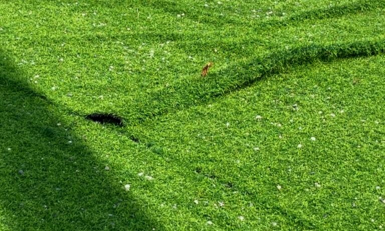 人工草皮皺折外翻,周邊還有許多垃圾,金峰鄉正興村興建完工近兩年的鄰里公園,有運動器材與兒童遊戲設施,溜滑梯、盪鞦韆等設施,是許多家長帶孩童來玩樂的場所,但近日公園環境出現髒亂及損壞,恐造成孩童安全上的疑慮。
