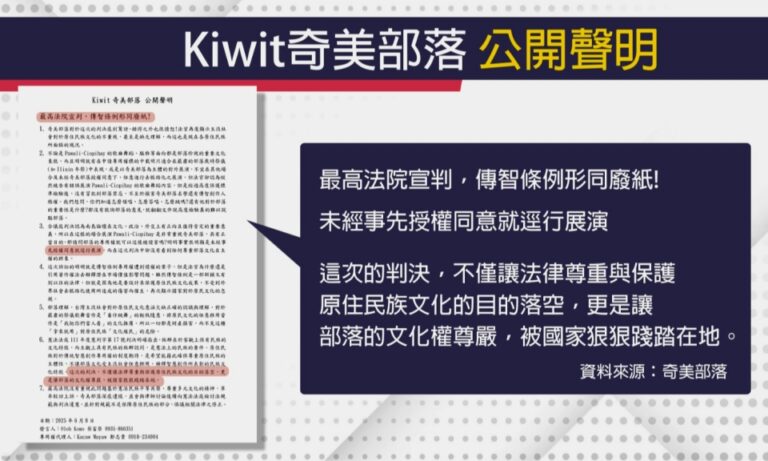 政經 奇美部落 專用權訴訟案 最高法院駁傳智案上訴 奇美部落發布聲明 165 2018年未經奇美部落事先同意使用的Pawali-Ciopihay勇士舞,而引發的傳統智慧創作專用權訴訟案,在5月29日遭最高法院宣判裁定上訴駁回;而消息一出,也讓部落感到遺憾。 2025-06-10 19:04
