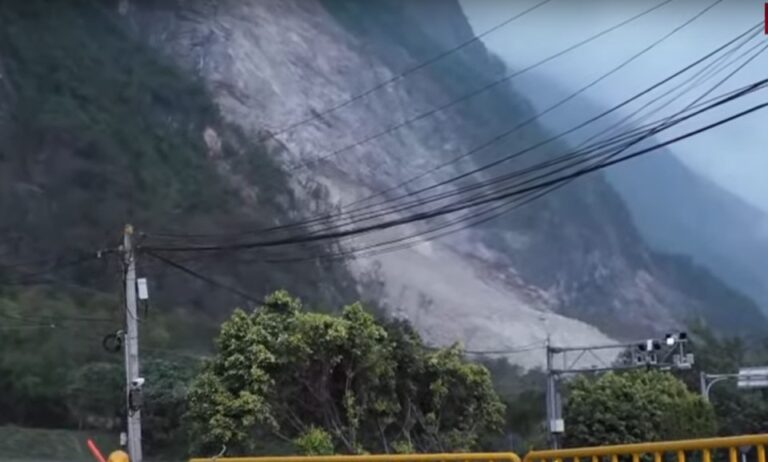 記者 Kimliyan(陸萱):「現在記者所在的地方,是花蓮秀林鄉、這裡是崇德管制站,目前已經拉起黃色的鐵門柵欄,要管制出入的車輛,目前可以看到崇德村這邊的山坡旁邊,再發生7.2的強震之後,發生大面積的邊坡崩塌,土石堆還在山腳下。