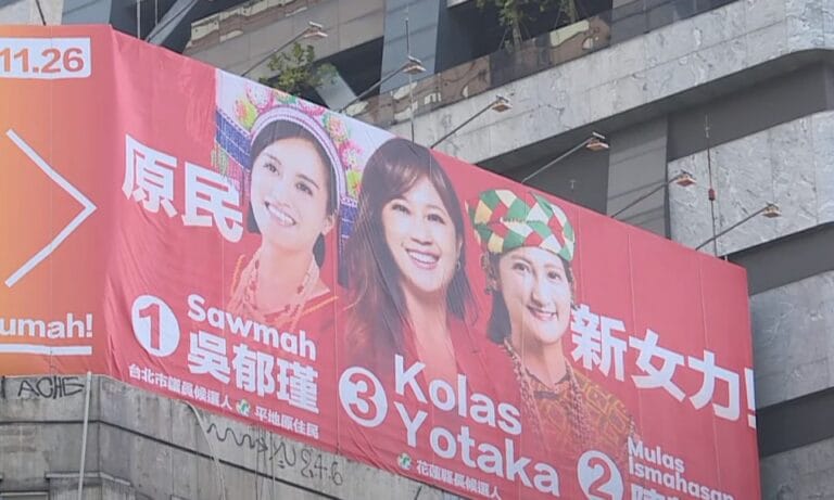 記者 Aras Sawawan說:「大大的看板卻印著花蓮縣長候選人Kolas的照片,不過您可能也注意到了,我們現在所在的位置卻是在台北市,就連Kolas兩側站的兩位,也都是這次台北市原民議員的候選人,這樣的情況難道是Kolas也要參選台北市長嗎?」...。