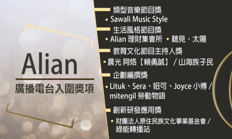 教文 原文會 廣播金鐘 【涉己新聞】Alian惜無緣敲響金鐘 6大獎入圍即是肯定 4 第58屆廣播金鐘獎頒獎典禮,14號晚間在國父紀念館盛大登場,Alian原住民族廣播電台這次有6項入圍,其中包含Sawali Music Style入圍類型音樂節目獎,晨光阿烙入圍教育文化節目主持人獎、還有企畫編輯等大獎。 2023-10-15 12:20
