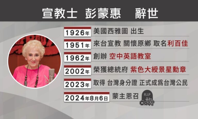 透過歌舞展現彭蒙惠踏上宣教的生涯,空中英語教室創辦人彭蒙惠今年8月6日辭世,享耆壽98歲;救世傳播協會等單位,在9月20日舉行了彭蒙惠紀念音樂會,統府也藉此頒贈褒揚令,前總統蔡英文也親自出席整場活動。