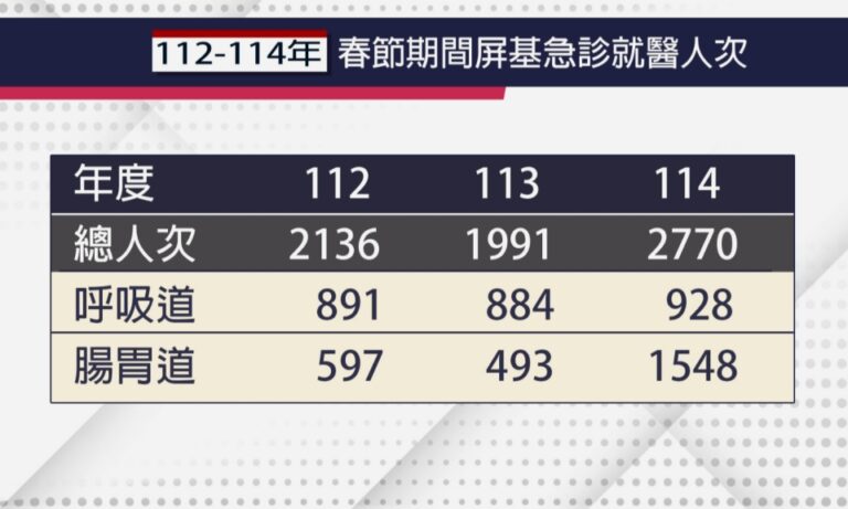 醫療 屏東基督教醫院 急診就醫人次 春節 春節屏基急診病患 近9成腸胃不適、呼吸道感染 40 春節連假結束,各行各業陸續開工上班,但屏東基督教醫院急診室卻人滿為患;據醫院統計自1月27日到2月1日,急診室就湧進2770人次,相較112年2136人次、以及113年的1991人次都增加不少。 2025-02-03 19:08