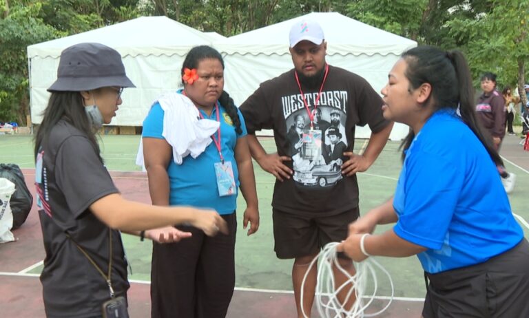 來自夏威夷的選手在籃球場上練習撒網,完美的拋網動作獲得場邊一致好評。