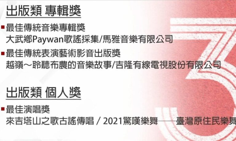 第33屆傳藝金曲獎在9號公布入圍名單,今年共有822件作品參賽,其中,有3組原民作品脫穎而出,分別是大武鄉Paywan歌謠採集,入圍「最佳傳統音樂專輯獎」、越嶺~聆聽布農的音樂故事,入圍「最佳傳統表演藝術影音出版獎」,以及「來吉塔山之歌古謠傳唱」入圍「最佳演唱獎」。