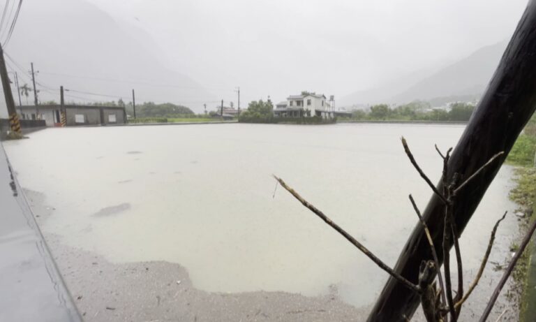 記者 Rowbaw Seyhu (温庭萱):「記者所在的位置是在南投縣仁愛鄉互助村的中原部落,那聽附近居民說其實昨天(24)就開始有下零星的雨,今天雨就開始下得非常地大,已經大到你看我左手邊原本是一塊又一塊的農田,但因為今天的超大豪雨,所以已經淹起來,像是一面的湖,甚至水都滿出來,已經流到了道路上了。