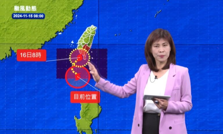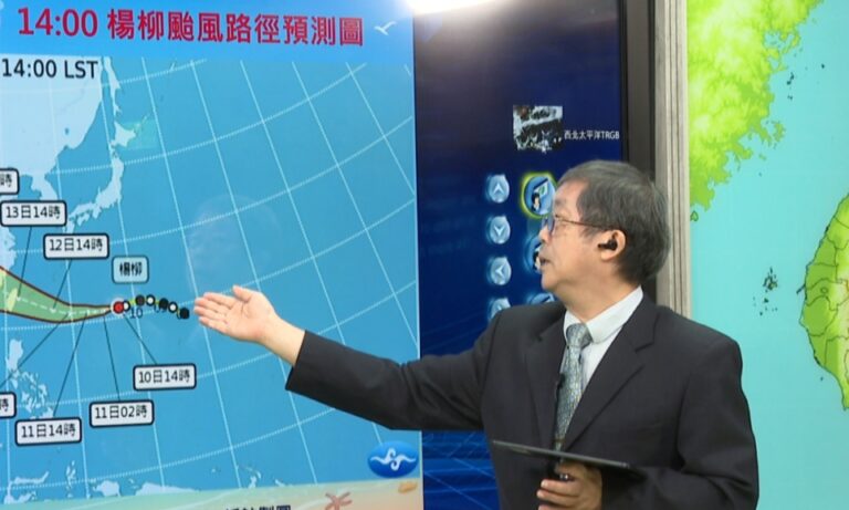 交通部中央氣象署預報員 林定宜:「目前颱風還是屬於輕颱上限的程度,預估未來12到18小時之間,會逐漸增強到中度颱風的強度,從路徑預測圖看到颱風目前是往偏西方向前進,當明天到達琉球海域的時候,可能會逐漸轉向西北西的方向來行進,大致上是在13號的時候最靠近我們,14號的時候會逐漸遠離我們,所以預估在星期二的時候,不排除會先後發布海上與陸上的颱風警報;13號這一天要特別注意整個西半部地區,東北部以及東部地區,可能都有局部大雨或是豪雨發生的機率,這個雨勢預估在14號下半天,颱風會逐漸地遠離。