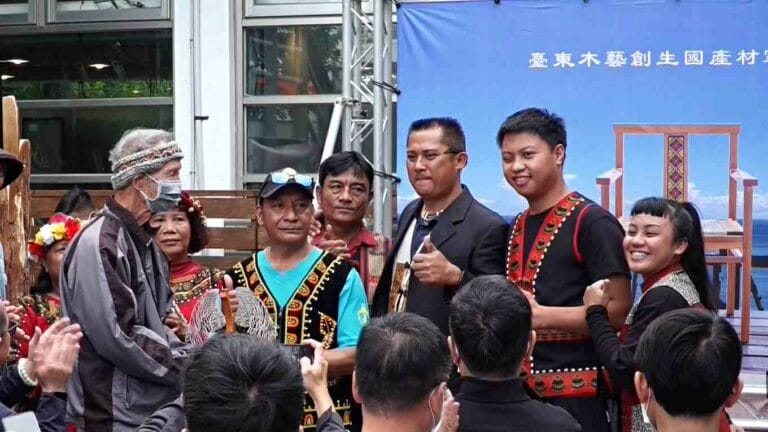 整面桃花心原木餐桌,溫暖色調搭配自然木紋,給人一種簡約大方的舒適感,尤其椅子還結合排灣族十字繡,帶有一番民族風,而一旁的杉木立燈,則是可透過活動卡榫調整角度,展場內一件件原木家具,個個別有巧思,且全都是由國產林木所設計製作。