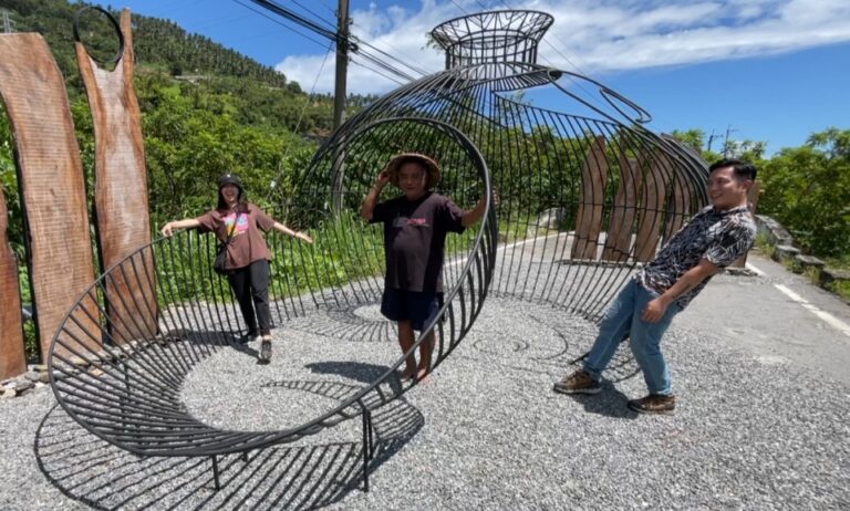 教文 南迴藝術季 武撒恩 武撒恩任代言人 率體驗團認識南迴藝術作品 37 藝術家講解自己的作品如何取景拍照,這件作品位在金峰鄉新興國小旁舊路橋的藝術作品「生根合力」,由新興與北里村兩位藝術家共同創作,以陶壺象徵生命的空間孕育出排灣族群與文化,而鐵材紋路在陽光照射下呈現不同光影,相當特別。 2023-09-21 12:21