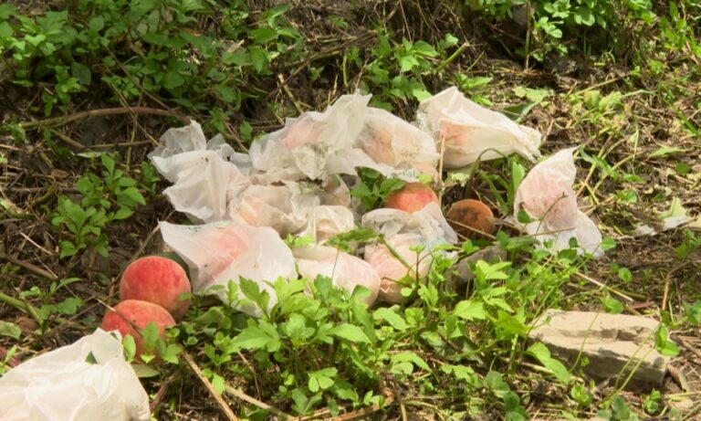 一顆顆紅潤的水蜜桃,還來不及採收,連同保護紙套,都被颱風及外圍環流的風給吹落,一年的辛勞就這樣打水漂,農民表示收成減少2至3成。