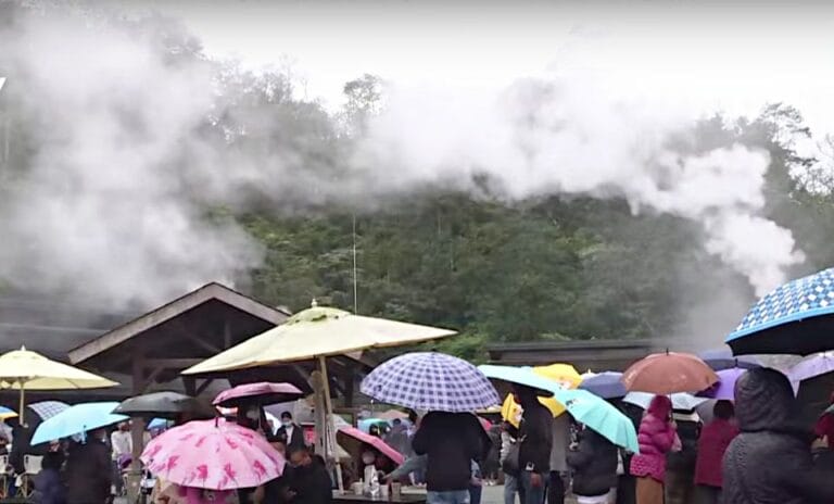記者 Cemedas Dumalalrath(江子芊)在現場觀察表示:「灰色的天空,微涼的溫度,根據氣象局預估,初三全台各地都會有降雨的情形發生,許多人的行程也許都泡湯了;但在宜蘭清水地熱園區,可是擠滿了想要泡湯的民眾。