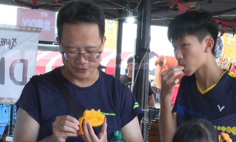 又大又紅的愛文芒果一擺出來,遊客蜂擁而至,搶著挑選。