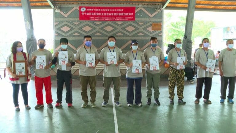 原鄉 生活 德卡倫部落 狩獵 獵人證 自主管理 德卡倫頒發獵人證 期待朝自主管理邁進 70 德卡倫部落族人一同宣示,表達遵守公約、守護泰雅傳統狩獵文化的決心,現場也逐一頒發共50張獵人證。 2022-04-12 19:08