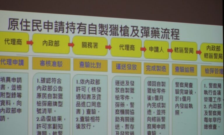 南興部落會議主席 高德昆:「購買的時候它這個槍枝是不是有產品的保障,比如說槍枝非人為操作損壞,它造成人員的傷損的時候有沒有產品的保險?」 面對原住民漁民自製獵槍魚槍許可及管理辦法即將上路,部落族人趁著座談會提出疑慮,尤其草案限定未來獵槍生產製造及零組件由國外代理進口,因此會議一開始族人就聚焦在槍枝安全及保險理賠規範。
