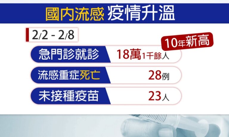 流感疫情肆虐,疾管署統計上周(2/2–2/8)急門診就診人次來到18萬1千餘人,是10年來同期最高點;而上周也新增近有28例流感重症死亡病例,其中23名個案沒有接種流感疫苗。