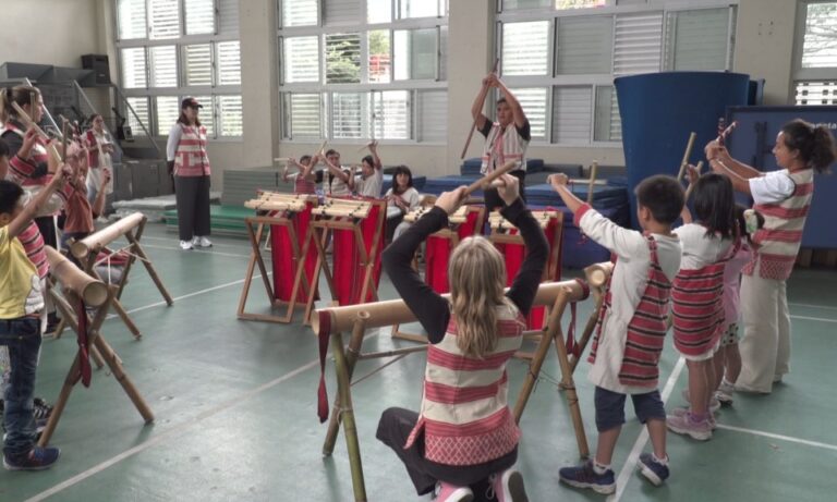 來自美國奧勒岡州立大學公衛學院的五位碩博士生,在發祥國小與小學生們一起學習傳統泰雅族樂器;這些美國學生透過校外教學計畫,除了來進行文化交流外,同時也來研究台灣的公衛政策。
