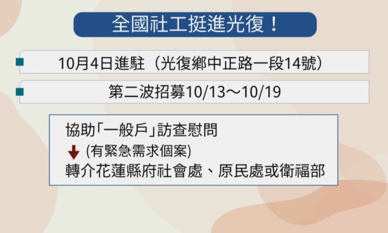 原鄉 生活 社工專業 花蓮光復 馬太鞍溪堰塞湖事件 災後人力邁臨界點 長期重建仰賴支持系統 60 馬太鞍溪堰塞湖災後十多天,大批愛心湧入花蓮光復,這當中也包含來自全國各地的社工人員。 2025-10-06 19:12