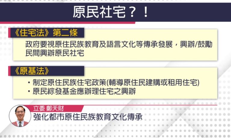 國民黨立法委員 Sra Kacaw(鄭天財):「住宅法修正公布已經八年三個月,專供原住民的社會住宅一個都還沒有。