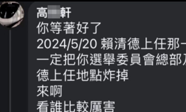 帶領競選團隊,深深一鞠躬,這屆大選由賴清德、蕭美琴當選總統、副總統,但當天開票結果確定後,中央選委會的臉書粉絲專頁,竟然有人留言要在5月20日賴清德上任當天,將選舉委員會總部以及賴清德上任地點炸掉,檢警組成專案小組深入追查,鎖定屏東一名羅姓男子。