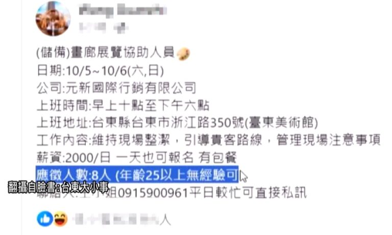 生活 展覽徵才 美術館 詐騙手法 台東傳展覽徵才詐騙 文化處公告籲勿上當 104 台東美術館積極策展,目前9月展覽的前置工作也已進入尾聲,但近期在台東地方臉書社群上,卻莫名出現一篇徵才訊息,表示美術館在10月5日、6日要徵8名工作人員,給予一天2000元工資,引起不少網友關注。 2024-09-06 19:15